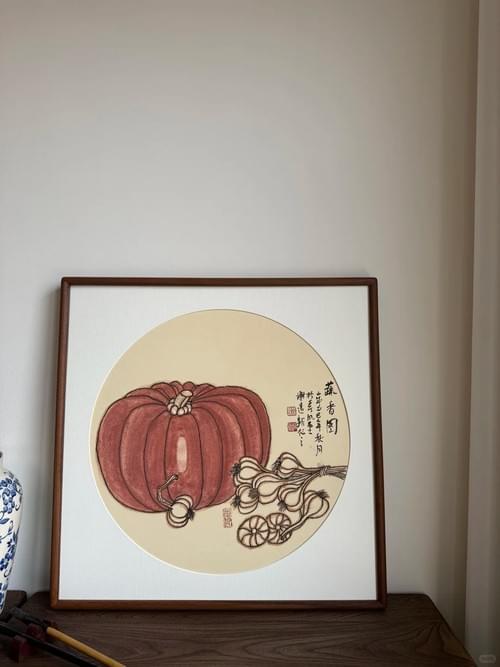 整体画面通过南瓜、大蒜等日常蔬果,表达了对五谷丰登、家庭安康、生活富足的美好祝愿。#餐厅挂画 #国画 #茶室挂画 #挂画 #装饰画 #客厅装饰画 #全屋配画 #国画瓜果蔬菜 #纯手绘国画#秋天就是丰收的季节